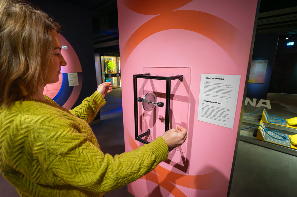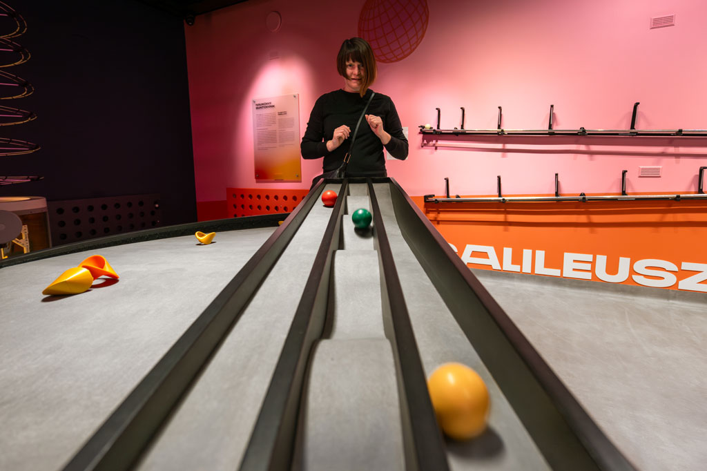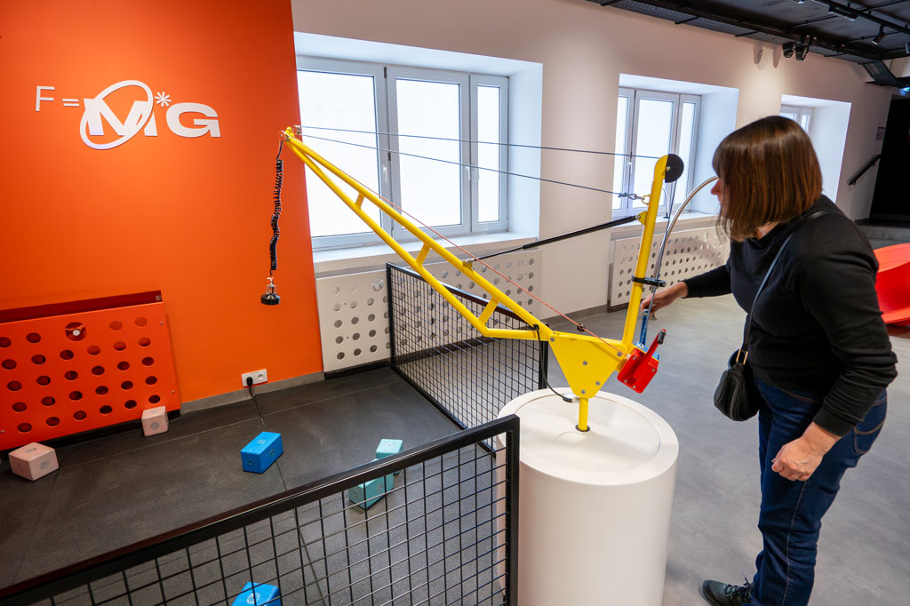 Zu sehen sind unter anderem Newtons Kugelstoßpendel, ein Doppelpendel, das Maxwellsche Rad und ein schwebender Tensegrity-Stuhl. Die Besucher können auch einen Kran bedienen oder riesige Dominosteine in Bewegung setzen. Nach dem „Andocken“ an eine Raumstation lässt sich die Geschichte des Universums ergründen. Wie fühlen sich Sprünge auf dem Mond an, wie sieht ein Gravitationsbrunnen aus? Kurze Anleitungen zu den Exponaten sind beim selbständigen Experimentieren behilflich. Haben Sie Freude am Entdecken!
