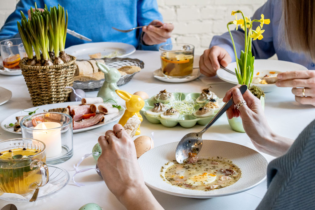 El domingo suele celebrarse en familia con un desayuno, felicitaciones y la tradición de compartir el huevo bendecido el sábado anterior. Y los dos días siguientes son días de mesa, con platos tradicionales como las típicas sopas – żurek o borsch blanco, jamón ahumado con humo de enebro, salchicha blanca servida caliente, carne asada, patés y repostería tradicional, con sus baby, mazurki y tartas de queso.
